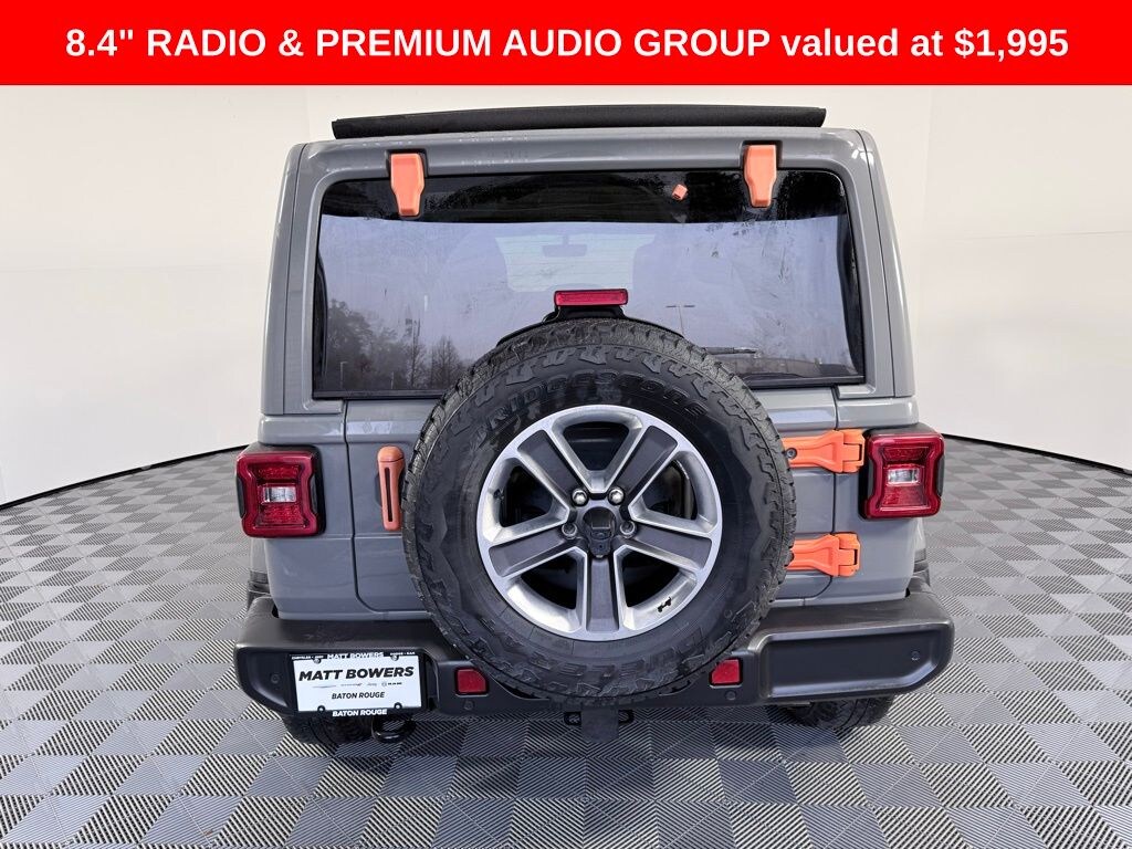 1-Year SiriusXM Guardian Trial, 3.45 Rear Axle Ratio, 4-Wheel Disc Brakes, 4G LTE Wi-Fi Hot Spot, 5-Year SiriusXM Traffic Service, 5-Year SiriusXM Travel Link Service, 8 Speakers, 8.4" Radio & Premium Audio Group, 8.4" Touchscreen Display, ABS brakes, Air Conditioning, Alloy wheels, Alpine Premium Audio System, AM/FM radio: SiriusXM, Apple CarPlay, Apple CarPlay/Android Auto, Auto-Dimming Rear-View Mirror, Automatic temperature control, Aux Battery, Blind Spot & Cross Path Detection, Brake assist, Cloth Low-Back Bucket Seats, Compass, Daytime Running Lamps LED Accents, Delay-off headlights, Driver door bin, Driver vanity mirror, Dual front impact airbags, Dual front side impact airbags, Electronic Stability Control, Emergency/Assistance Call, For Details, Visit DriveUconnect.com, Front anti-roll bar, Front Bucket Seats, Front Center Armrest w/Storage, Front dual zone A/C, Front fog lights, Front LED Fog Lamps, Front reading lights, Fully automatic headlights, Garage door transmitter, Google Android Auto, GPS Antenna Input, GPS Navigation, HD Radio, Heated door mirrors, Heavy Duty Suspension w/Gas Shocks, Illuminated entry, Integrated roll-over protection, Integrated Voice Command w/Bluetooth, Leather steering wheel, LED Lighting Group, LED Premium Reflector Headlamps, LED Taillamps, Low tire pressure warning, Manufacturer's Statement of Origin, Mopar Black Tubular Side Steps, Non-Lock Fuel Cap w/o Discriminator, Occupant sensing airbag, Outside temperature display, Panic alarm, ParkSense Rear Park Assist System, ParkView Rear Back-Up Camera, Passenger door bin, Passenger vanity mirror, Power door mirrors, Power steering, Power Top Quarter Window Storage Bag, Power windows, Quick Order Package 25G, Radio data system, Radio: Uconnect 4 w/7" Display, Radio: Uconnect 4C Nav w/8.4" Display, Rear anti-roll bar, Rear reading lights, Remote keyless entry, Remote Start System, Removable Rear Quarter Windows, Safety Group, Security system, SiriusXM Traffic Plus, SiriusXM Travel Link, Sky 1-Touch Power Top, Speed control, Split folding rear seat, Steering wheel mounted audio controls, Stop-Start Dual Battery System, Tachometer, Telescoping steering wheel, Tilt steering wheel, Traction control, Trip computer, Variably intermittent wipers, Voltmeter, Wheels: 18" x 7.5" Polished w/Gray Spokes, Wheels: 18" x 7.5" Tech Gray Machined Face. 20/24 City/Highway MPG Recent Arrival!