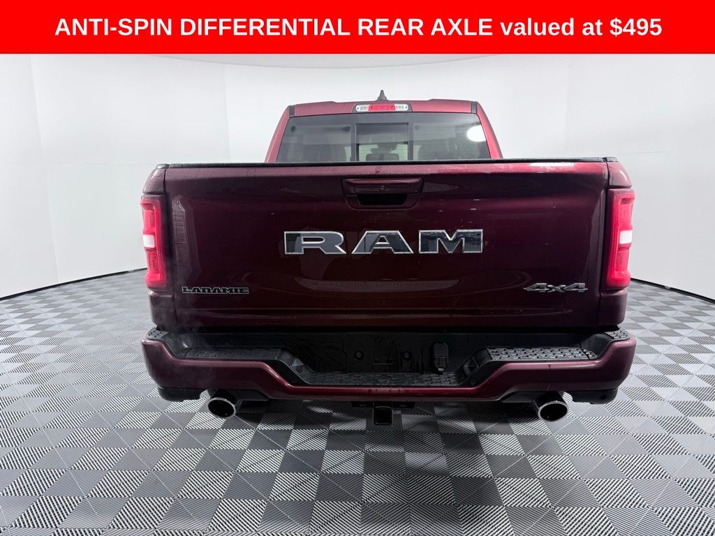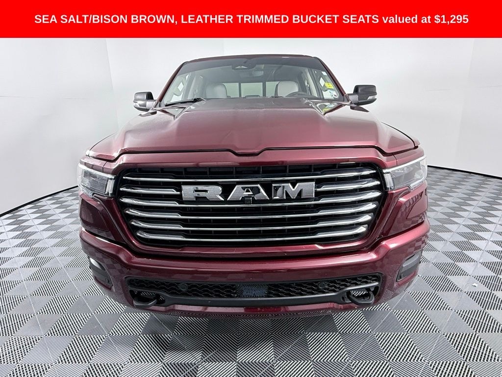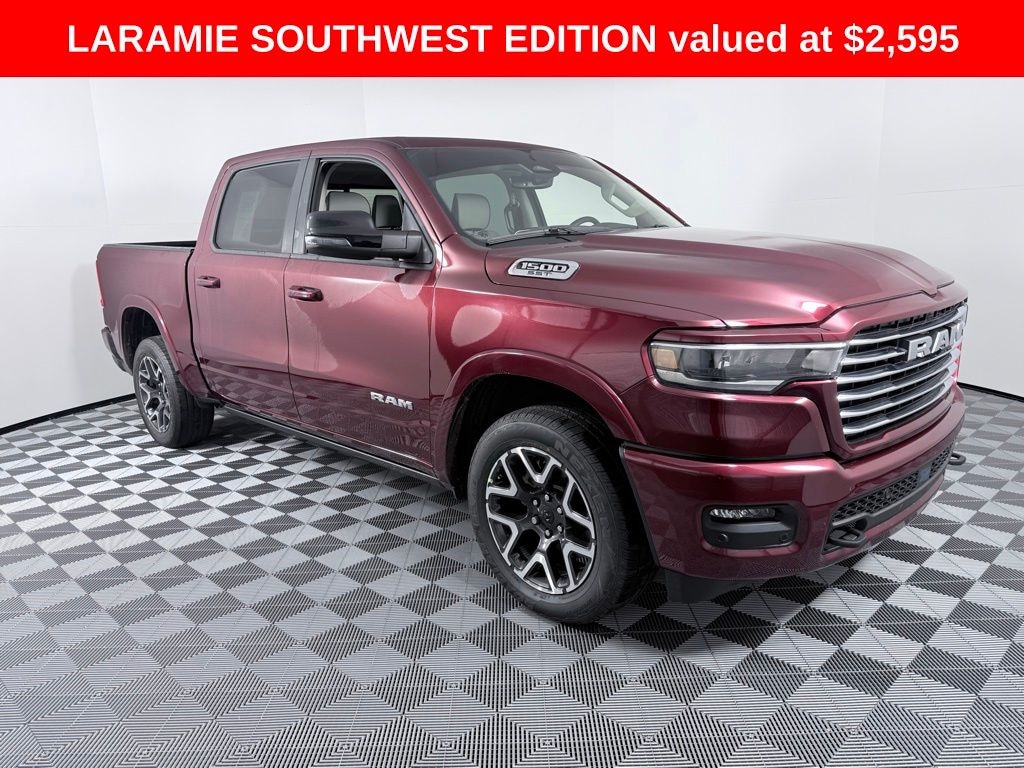 10 Speakers, 3 Rear Seat Head Restraints, 33 Gallon Fuel Tank, 4 Way Front Headrests, 4-Wheel Disc Brakes, 4G LTE Wi-Fi Hot Spot, ABS brakes, Accent Color Premium Power Mirrors, Air Conditioning, Alloy wheels, AM/FM radio: SiriusXM with 360L, Anti-Spin Differential Rear Axle, Apple CarPlay, Apple CarPlay/Android Auto, Audio memory, Auto High-beam Headlights, Auto Power-Folding Mirrors, Auto-dimming door mirrors, Auto-Dimming Exterior Driver Mirror, Auto-dimming Rear-View mirror, Automatic temperature control, Black Painted Exterior Mirrors Caps, Body Color Front Bumper, Body Color Rear Bumper w/Step Pads, Brake assist, Bumpers: chrome, Chrome Exterior Mirrors, Compass, Connected Travel & Traffic Services, Connectivity - US/Canada, Convex Wide-Angle Exterior Mirror Insert, Delay-off headlights, Dome Dual LED Reading Lamp, Driver door bin, Driver Seat Memory, Driver vanity mirror, Dual front impact airbags, Dual front side impact airbags, Dual-Pane Panoramic Sunroof, Electronic Stability Control, Exterior Mirrors Courtesy Lamps, Exterior Mirrors w/Heating Element, Exterior Mirrors w/Memory, Exterior Mirrors w/Supplemental Signals, Front anti-roll bar, Front Center Armrest w/Storage, Front dual zone A/C, Front fog lights, Front License Plate Bracket, Front reading lights, Front Seat Back Map Pockets, Front wheel independent suspension, Fully automatic headlights, Garage door transmitter, Google Android Auto, GPS Antenna Input, GPS Navigation, Grille Surround 3 Body Color Tex 4 Chrome, HD Radio, Heated door mirrors, Heated Front Seats, Heated front seats, Heated rear seats, Heated Steering Wheel, Heated steering wheel, Illuminated entry, Integrated Voice Command w/Bluetooth, Laramie Level 1 Equipment Group, Laramie Southwest Edition, Leather steering wheel, Leather Trim 40/20/40 Bench Seat, LED Dome/Reading Lamp, Low tire pressure warning, Memory seat, MOPAR Front & Rear Rubber Floor Mats, Navigation System, Occupant sensing airbag, Outside temperature display, Overhead airbag, Overhead console, Panic alarm, ParkView Rear Back-Up Camera, Passenger door bin, Passenger vanity mirror, Power 2-Way Driver Lumbar Adjust, Power 2-Way Passenger Lumbar Adjust, Power Adjust 8-Way Front Passenger Seat, Power Deployable Running Boards, Power door mirrors, Power driver seat, Power passenger seat, Power steering, Power windows, Quick Order Package 21H Laramie, Radio data system, Radio: Uconnect 5 Nav w/12.0" Display, Rain Sensitive Windshield Wipers, RAM Grille Badge - Chrome, Rear anti-roll bar, Rear reading lights, Rear seat center armrest, Rear step bumper, Remote keyless entry, Remote Tailgate Release, Security system, SiriusXM w/360L, Speed control, Split folding rear seat, Steering wheel mounted audio controls, Tachometer, Telescoping steering wheel, Tilt steering wheel, Tow Hooks, Traction control, Trailer Brake Control, Trip computer, Turn signal indicator mirrors, USB Host Flip, Variably intermittent wipers, Ventilated Front Seats, Ventilated front seats, Voltmeter, Wheels: 20" x 9" Premium Paint/Polish. 17/24 City/Highway MPG Recent Arrival!